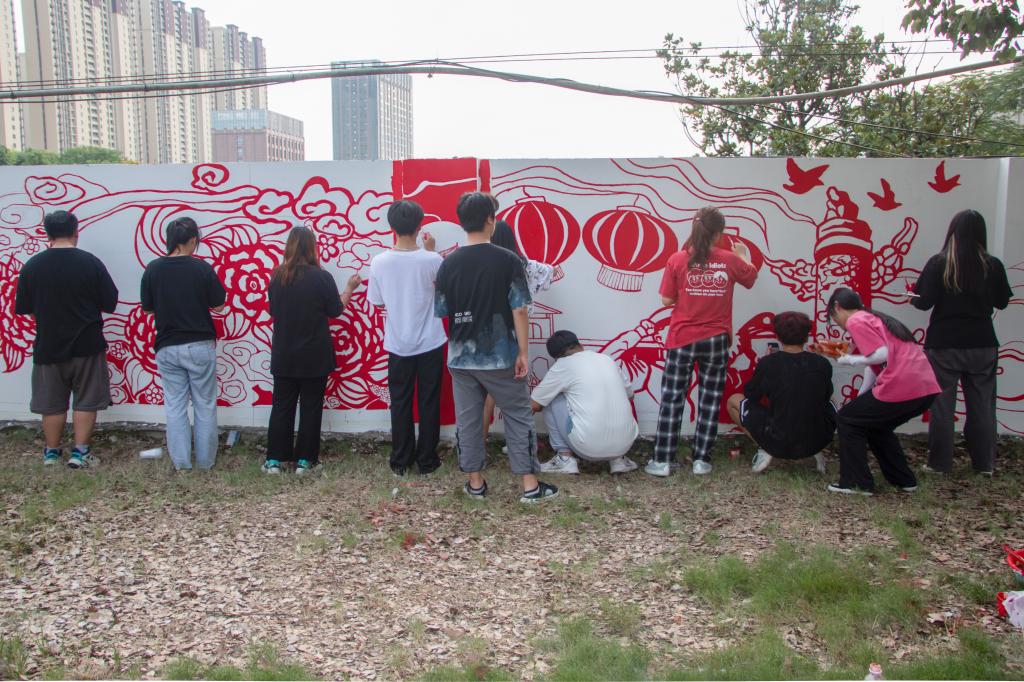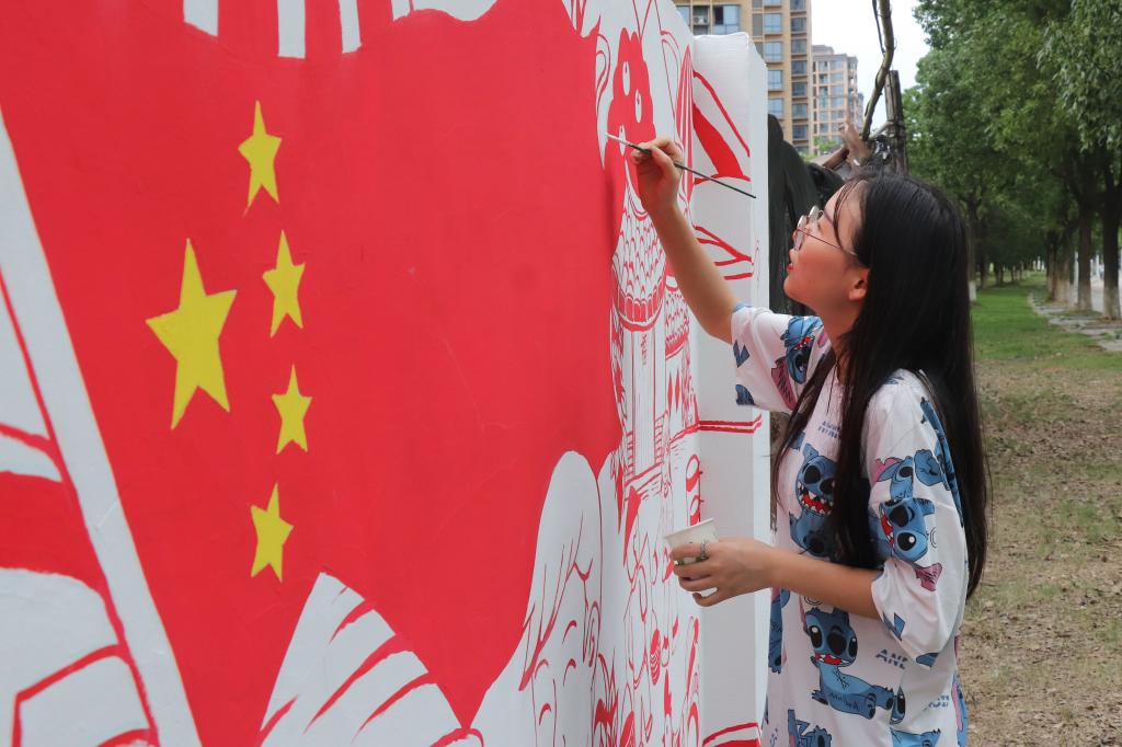 以红色为底色,用中国书法写上了一个大大的100周年字样,山川河流作为映衬,顶端还加上了朝阳图样,这是设计学专业2020(3)班汪芮设计的样图作品。“作品的样图是先自己根据主题进行打稿设计,然后经过老师修改后最终确定。”汪芮说,自己是第一次参加墙绘,从打形、上色到调颜料等各个方面,自己能力得到了很大的锻炼,“今后有这样的实践活动我都会积极参加!”她说。