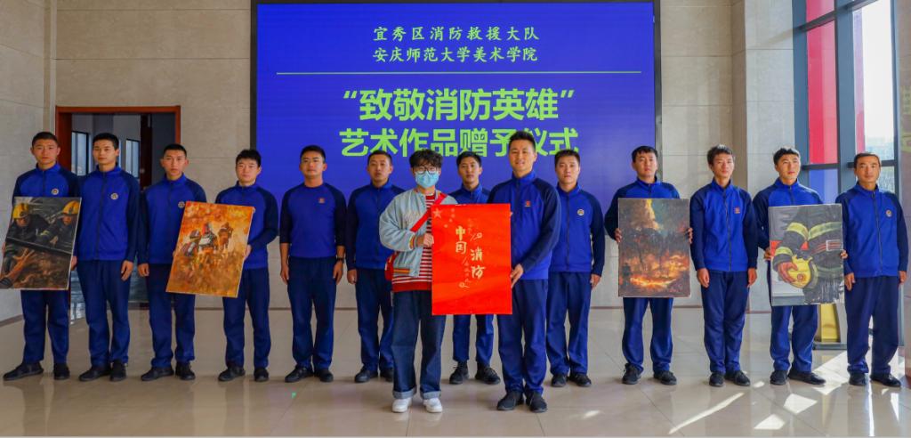 熊熊燃烧的火焰与波涛汹涌的海浪交相辉映着,一名身着醒目行装的消防战士昂然挺立火海,驰援在消防一线……11月5日,安庆市宜秀区消防救援大队大厅前摆放着的一幅幅美术作品吸引着来往队员的目光。美术学院赴安庆市宜秀区消防救援大队开展志愿服务活动,40名学生志愿者拿起手中的画笔,绘制出心中的“蓝朋友”。