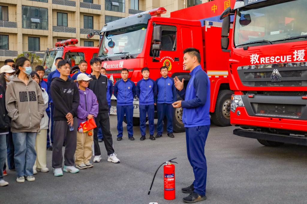 在消防员的带领下,志愿者们近距离参观了消防车以及各类救援设备,消防员详细地介绍了各类车辆的功能及各项设备的操作方法和操作事项。为提升学生在日常生活中的消防意识和自救能力,消防战士强调了使用灭火器的三个要点:顺风灭火、根部灭火、控制距离,还特意让在场学生们亲自动手体验如何操作灭火器。