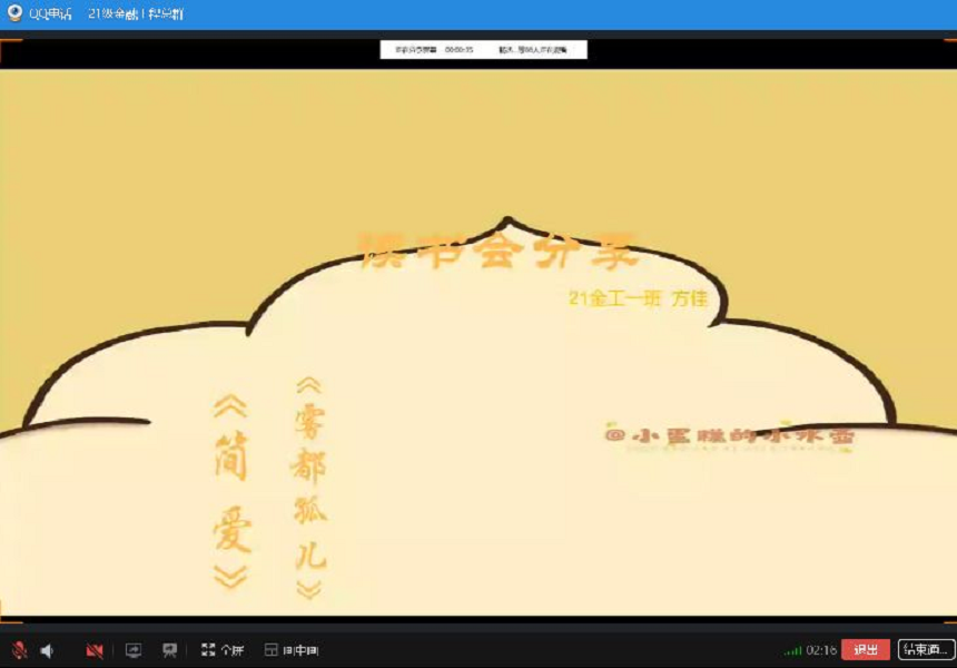 此次活动的负责人金融工程专业2021(2)班王心宇同学介绍,此次读书分享会很早便开始策划,虽然因为疫情的原因转移到线上举行,但还是在大家的帮助下顺利开展。该专业辅导员李颖说:“年轻人的想法应该让世界听见,希望通过读书分享会能够让学生们多读书、读好书,同时让每个人都有展示自我的机会。”(撰稿: 学生记者 李雪婷 摄影:王心宇 编辑:江伟 审核:周毅 钱敏)