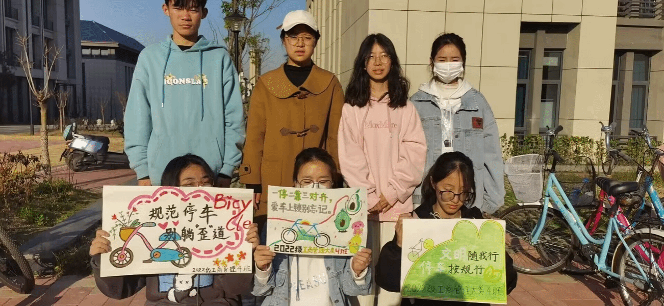 3月13日清晨,在经济与管理学院M楼门口,学院工商管理类专业2022(4)班的同学们积极主动地参与到规范停车的引导活动当中。志愿者们手持事先制作好的标语,引导大家规范停放自行车,并整理杂乱摆放车辆,对停车不规范行为进行现场劝导。
