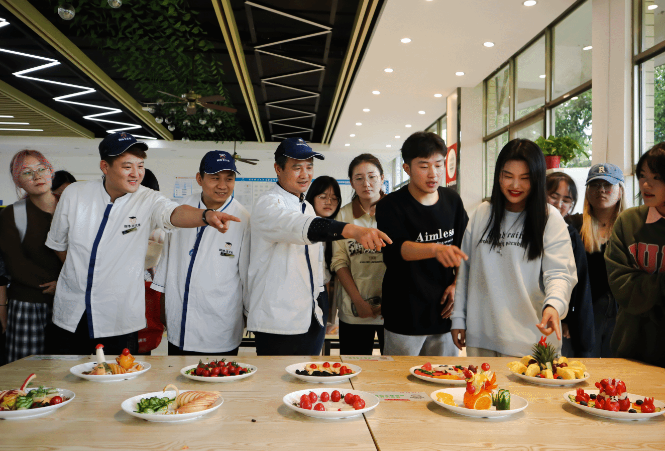 参赛学生自发组成10队,在制作过程中,学生们结合专业知识,运用巧妙合理的分工,从色彩搭配、造型设计等方面进行创意拼盘,最终由食堂师傅进行点评。1个小时的时间里,10件水果拼盘作品惊艳亮相,经过评委评比打分,最终评选出一等奖两名、二等奖三名、三等奖若干。