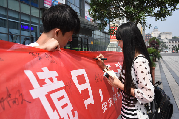 “叔叔您好,我们是大学生绿源环境保护协会的学生,今天是世界环境日……”人民路是安庆市区较为繁华的街道,路过的行人在大学生的讲解指导下,纷纷在横幅上签上自己的名字,更有父母带领孩子签名,“大学生来到市区向我们宣传很不容易,这些知识也是需要我们每个人牢记于心的。”一名年轻妈妈表示,希望孩子从小就能有环保意识。