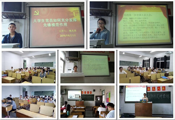 文学院学生第一党支部坚持每周举行创新形式讲党课活动,每次由两名党员结合PPT采用微课形式主讲,时间为8分钟左右,活动旨在充分发挥党支部的基础作用和学生党员的主体作用,促使学生党员努力学习“两学一做”,自觉坚定理想信念,在活动中让学生党员动起来,让学习思路活起来,让讨论氛围浓起来,让学做风气领起来。截至目前,党支部先后讲了“大学生党员如何充分发挥先锋模范作用”、“中国共产党历届全国代表大会简介”等党课,党课讲解结束后,同学们交流感想、分享心得,还先后结合“三严三实”、“五查五看”等主题开展了讨论,观看了“张丽莉同志先进事迹报告会”视频,学习先进典型,同学们受益匪浅。