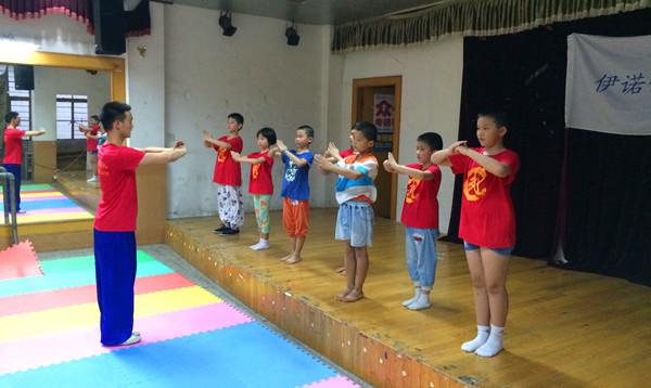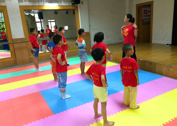 酷热三伏天,学员们仍然提前到达了活动地点,早早地就在垫子上做准备工作。教练性格也雷厉风行,上场后随即带领学员们进行热身锻炼。在课堂上,教练给学员们讲述武术的含义,制定武术兴趣班的课堂纪律,教授武术的基本动作。学员们的积极配合,教练们的悉心幽默的指导,使整堂课在幽默轻松的气氛下进行。