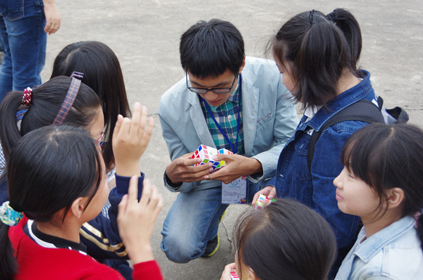 科普协会的会长龚宇晴认为:“魔方是款益智游戏,一方面让大学生与小学生之间产生了更深层次的交流,另一方面能带动小学生去探索,活跃他们的思维能力。”(图/文 学生记者 蔡贤嘉)