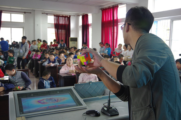 “大家知道魔方的创始人是谁吗?”科普协会的成员王琪在石化三小多媒体教室里展示了关于魔方科普知识的PPT,她刚抛出问题,小学生们就纷纷举起了手准备抢答。当讲到魔方的种类时,现场更是展示了多种多样的魔方类型,让小学生们大饱眼福。“我们事先在网上以及相关书籍查询魔方的知识,再带动协会里会玩魔方的成员参与进来。”科普协会的会长龚宇晴介绍说。
