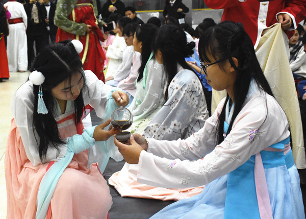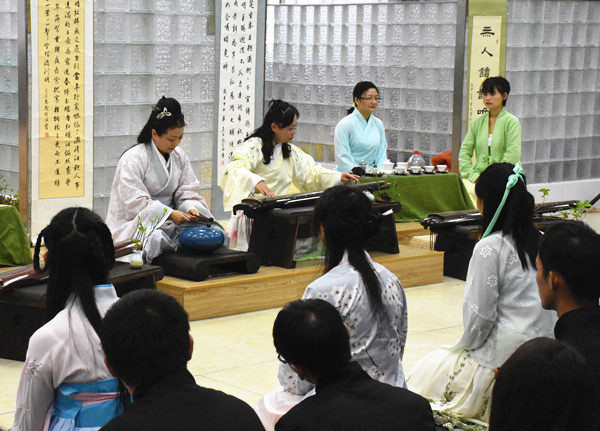 秋雨绵绵,落叶纷飞。穿一身汉服,在悬挂着字画的室内席地而坐,静静聆听极具古韵的古琴曲,观禅意插花,赏茶艺表演。这并不是电视剧的拍摄现场,而是出现在菱湖校区的真实场景。