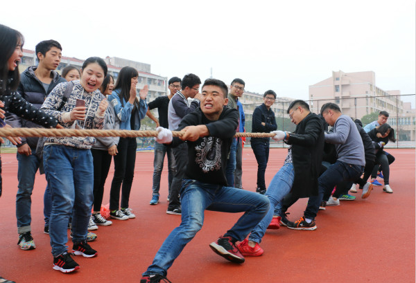 13日上午进行的团体赛为各社团代表组成队伍相互进行PK。团体跳绳比赛新增的指压板需要5名参赛队员一边配合队友跳绳,一边忍受着脚下来自指压板的疼痛考验。期间,有的协会尝试不久便通过,有的尝试第一轮5次机会后没有通过,但他们并没有放弃,而是在一旁相互喊加油鼓励,尝试第二轮比拼。“很难得一个机会能把社团会员聚在一起,只想共同把它完成好,忘记试了多少次了,也忘记脚下的疼痛了。”大学生电子琴爱好者协会会长邓佳蕊这样说道。压轴项目团体拔河比赛,裁判员一声令下,双方队伍各自协作出力,拼力把绳子拉向自己队伍一边,现场气氛高涨。