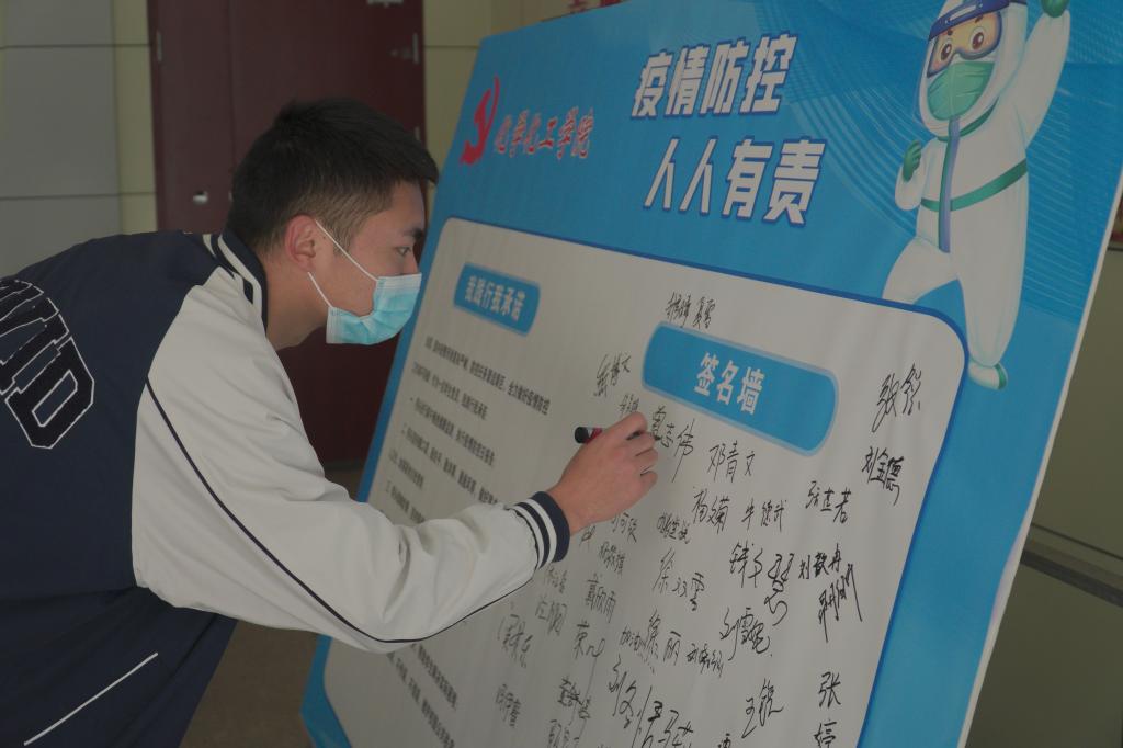 此外,学院还开展了“我承诺我践行”疫情防控宣誓签名活动,倡议全体师生党员做好“七个带头”。教师党员江彬彬在承诺书上郑重地签下了自己的名字,他说“作为一名教师党员,在疫情防控常态化的背景下,我们更应该带头遵守疫情防控规定,引导师生正确理解、积极配合、科学参与疫情防控,切实维护校园秩序和安全。”