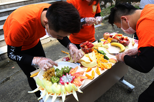 比赛获得一等奖的是14号小组的作品“果然美味”。同款的T恤,同色的口罩,团队一致的服饰外观帮他们吸引了更多人的眼球。“你把草莓均匀切开,然后将猕猴桃雕成莲花再去皮,你把苹果切成均匀四瓣,再把橙子皮削长一点。”队长孔德磊一边雕哈密瓜一边指挥队友加工手中的水果。随着手中的水果刀起起落落,雕花刀灵活运转,薄薄一层果皮从果肉上分离。经过近1个小时的精雕细琢,多种水果被做成形态各异的花朵立在盘中,让人垂涎欲滴。制作完参赛的作品后,孔德磊和他的小伙伴们还为现场的观众准备了小果盘,浓稠的酸奶配上鲜艳的草莓,显得精致诱人。