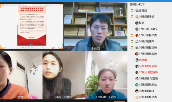4月8日,音乐学院学生党支部通过视频连线组织全体学生党员开展党日活动,学习习近平总书记两封“回信”精神,领悟青春绽放的正确姿势。党总支副书记肖之进,各学生支部书记,全体学生党员参加了活动。