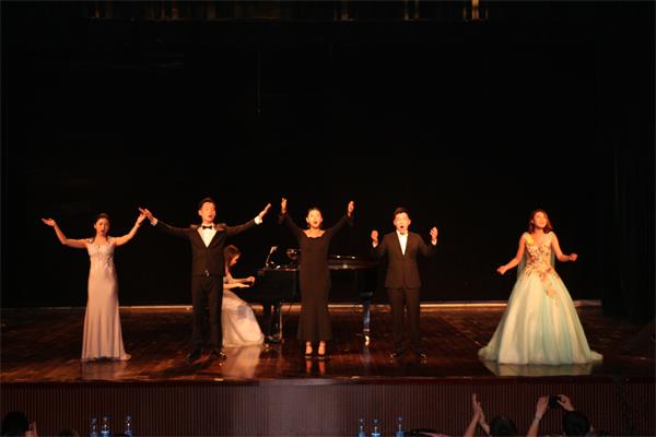曾洁的一首《玫瑰三愿》拉开了音乐会的序幕,演唱抒情优美,准确表达出了一位柔弱、不甘命运安排的女子对未来的美好憧憬。随后《大江东去》、《我住长江头》等一首首脍炙人口的声乐作品完美地呈现给大家。闻秀演唱的《海风阵阵愁煞人》将珊妹的形象演绎得立体、鲜活,恰到好处地拿捏作品中的戏曲韵味,同时,将人物的情感变化细腻地刻画出来。杨顺《父亲的草原母亲的河》的演唱悠扬婉转,技巧展现恰到好处,将听众带入了蒙古大草原,传达了大草原无法抗拒的震撼力。《大江东去》是中国艺术歌曲的开山之作,唐光华的演唱舒展、准确地拿捏作品的情感和内涵。顾婧一首歌剧选段《复仇的火焰在我心中燃烧》让现场观众体会到了歌剧的魅力,演唱者巧妙地控制声音力度的强弱、音色的变化,展现了强烈的戏剧感染力和震撼力。为了更好地展现艺术作品,把声乐与伴奏做到协调统一,钢琴教师赵元、杨飞虎应邀为他们钢琴即兴伴奏。这是一门集综合性、实践性为一体的技能,要求在歌曲旋律的基础上,双手快速而准确地弹奏出与之相适应的伴奏声部。一首首大气考验专业基本功的高难度曲子,在师生合作下得到了完美呈现。最后演员们深情合唱了经典老歌《我爱你,中国》,表达了毕业离别之际对祖国的深情,铿锵有力的乐曲将音乐会推向了高潮。