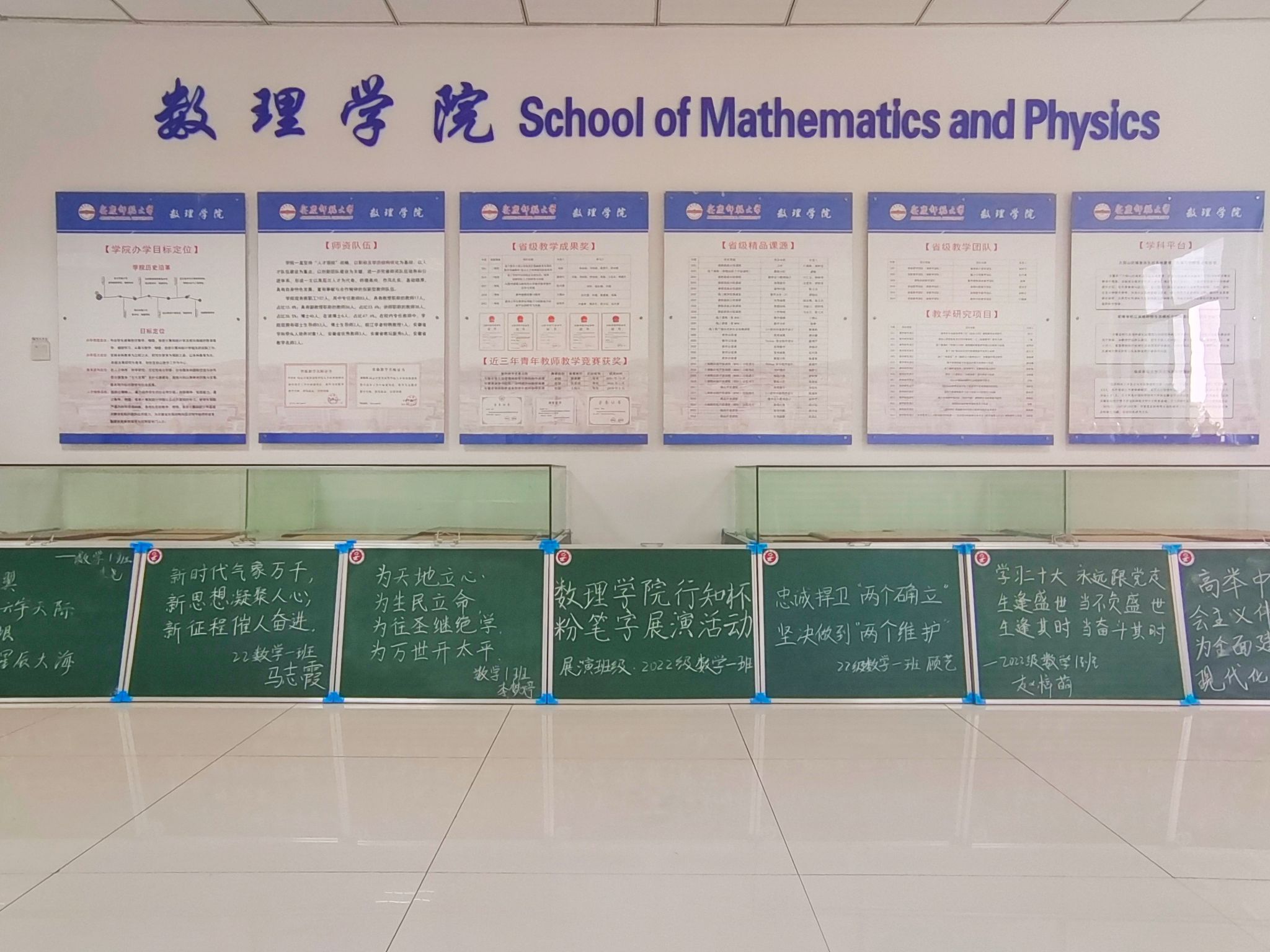 近日,数理学院举办以“学习二十大 书写新篇章”为主题的“行知杯”粉笔字展演活动。2022级全年级共15个班级全员参加。