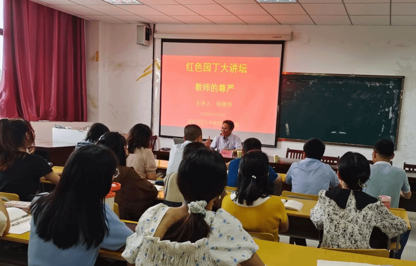 5月30日,山东师范大学教育学部部长、教授、博士生导师徐继存受邀为教师教育学院“红色园丁大讲坛”作“教师的尊严”学术报告,会议由副院长诸园主持,学院全体硕士研究生及部分本科生、教师现场聆听。