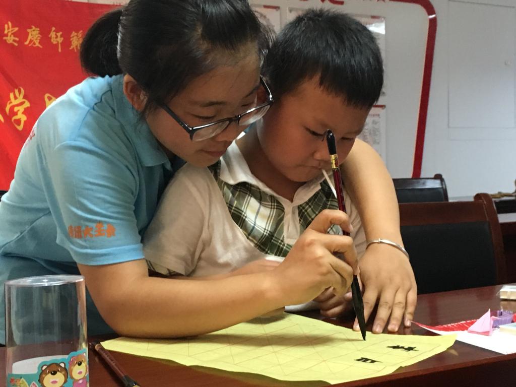 此外,志愿者们还向孩子们介绍了有关毛笔的知识,孩子们在志愿者们的带领下进行了毛笔执笔、横竖撇捺等书写练习。“梦想”、“中国”、“安庆”、自己的名字……这些字不仅仅呈现在纸上,更深深印刻在大家的心上。