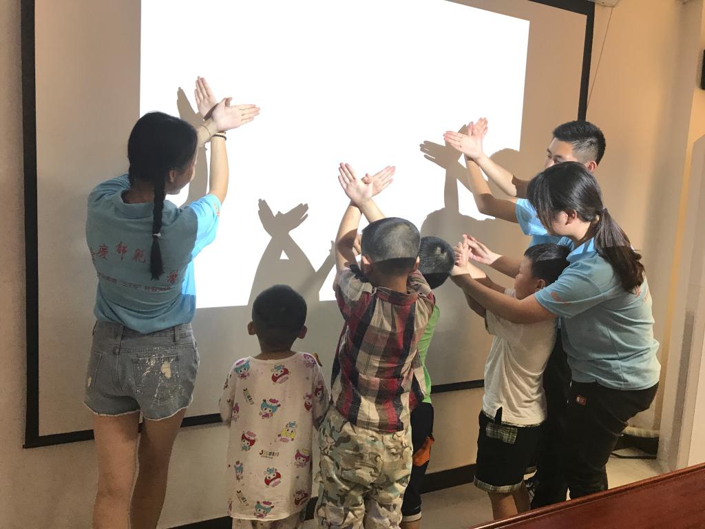 临别之际,服务团的志愿者们带着孩子们一起观看了电影《宝葫芦的秘密》,教育孩子们世界上没有不劳而获的东西,只有靠自己的努力,才能取得丰硕的收获。之后,志愿者们利用投影效果,和孩子们一起学习手影艺术。展翅飞翔的老鹰,活泼可爱的兔子,张大嘴巴的恶狗一时间都出现在投影屏幕上,小小的会议室里传出了孩子们阵阵欢快的笑声。