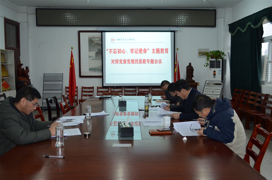 根据学院主题教育实施方案安排,11月25日上午,物理与电气工程学院党委在学院会议室召开 “不忘初心、牢记使命”主题教育对照党章党规找差距专题会。会议由学院党委书记江贵生主持,全体党委委员参加了专题会。
