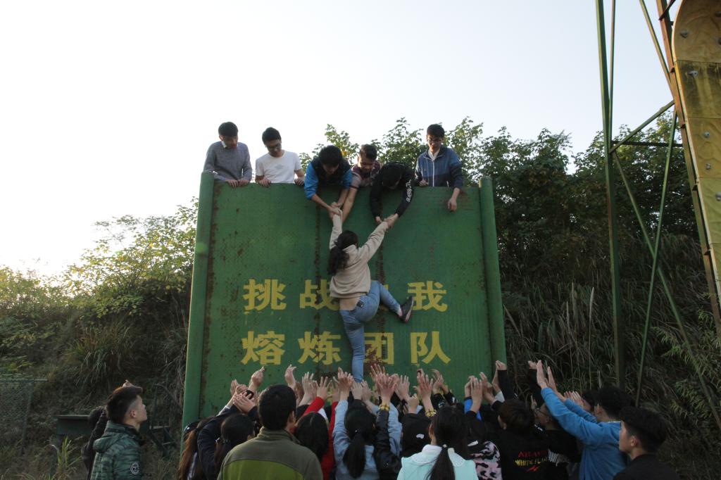 最后一个训练项目是"毕业墙",要求受训成员在不借助任何外界工具情况下,全员翻过4.3高的光滑墙壁。吸取了"硫酸河"失败的经验教训,队长主动承担分工和协调工作,搭建好基座,安排好翻墙次序,坚定的人梯将每一位同学顺利送到了墙的对面,在全员共同努力下,仅用了24分钟,45名同学全部翻越“毕业墙”。现场响起了热烈掌声,同学们露出了开心的笑容。