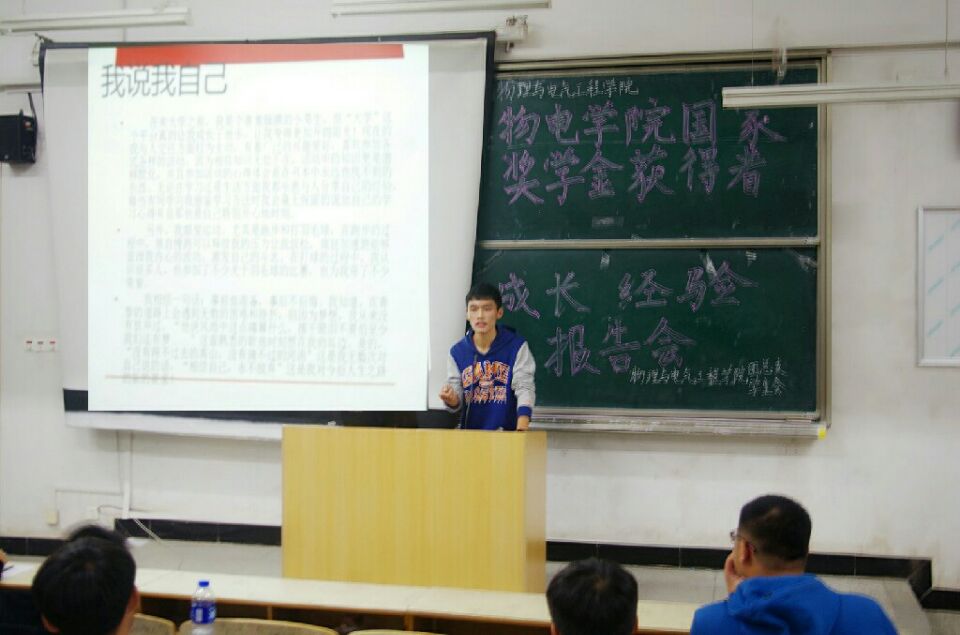 近日,物理与电气工程学院举办国家奖学金获得者成长经验报告会。获得2016-2017学年国家奖学金的康见平、王婉婉、李广润三位同学分别作报告,物电学院2017级全体学生分别聆听了报告。