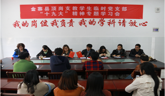 下午,党员师生驱车赶往鄂豫皖交界的汤汇镇,看望在那里坚守的顶岗支教学生,并参加了金寨县顶岗支教学生党员临时党支部的组织生活会。听取了顶岗支教工作的开展情况和临时党支部建设情况,为三位党员同学送去了新党章、党徽和学习十九大精神辅导读物,党员教师和支教学生一起开展了现场教学活动。