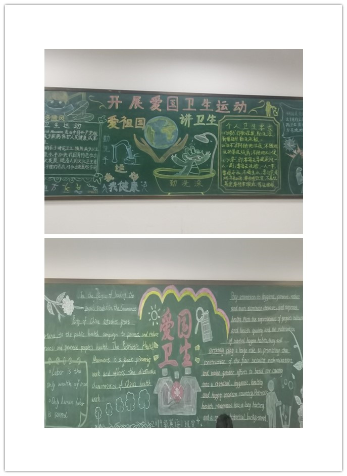 “爱国卫生运动”为主题的黑板报评比活动中,各班级在生活委员的带领下认真收集资料,精心构思版面。同学们绘画绿色地球的卡通形象,清晰地概括出“爱国卫生”的主要内容;设计抗疫主题的典型元素,形象地描述出做好疫情防控的主要措施;罗列真实且具体的数字,直观地说明培养健康的生活方式的重要性。一幅幅创意新颖、主题鲜明的板报,都流露了青年学生对建设健康美丽中国的美好祝愿。在谈及绘制初衷时,2019级英语5班的板报负责人都熠说道,“希望这种宣传方式能让同学们了解更多的卫生知识,提高防范疾病的自我保护意识,增强个人体质。”