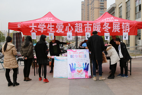 在展销会现场,手套、暖贴、热水袋、口罩、杯子、围巾……一件件物品摆放得整整齐齐。考虑到方便学生购买和展销物品的实用性,工作人员精心挑选了生活用品、冬季保暖用品等物品,并进行了分类摆放。“从批发商品到制定价格再到整理物资,我们一个月之前就开始了筹备。在献爱心的同时,我们希望以最大的优惠给全校同学。”徐纯洁说。