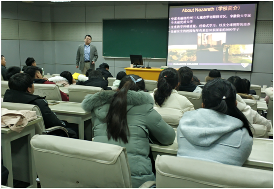 3月20日下午,美国拿撒勒大学语言学院院长、亚太办公室主任宋红专博士为17级国际经济与贸易中外合作班的学生举办有关中外合作教学的教育讲座。经济与管理学院院长杨国才、副院长潘锦云、17级国合班辅导员以及17级国合班全体同学参加了此次讲座。