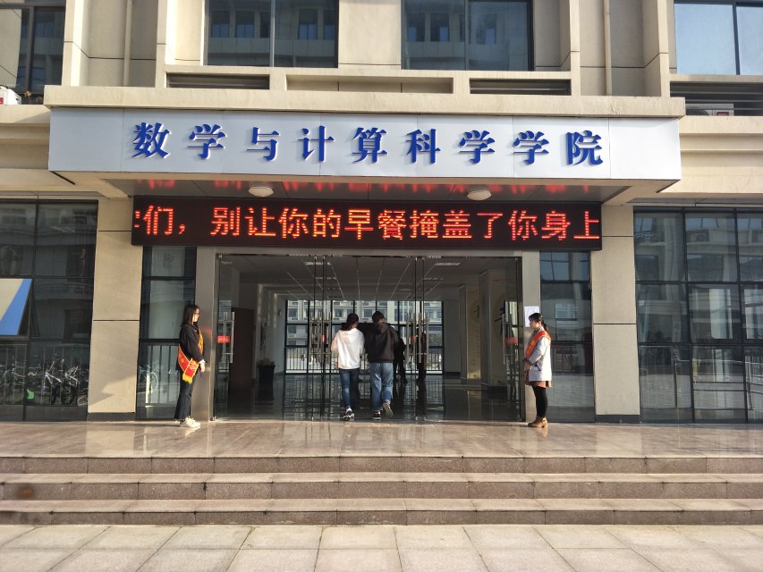 近日,由数学与计算科学学院团总支主办的为期两周的“拒绝早餐进教室,文明修身我先行”活动在数学楼成功举行,20余名表现出色的学生担任本次活动的志愿者。
