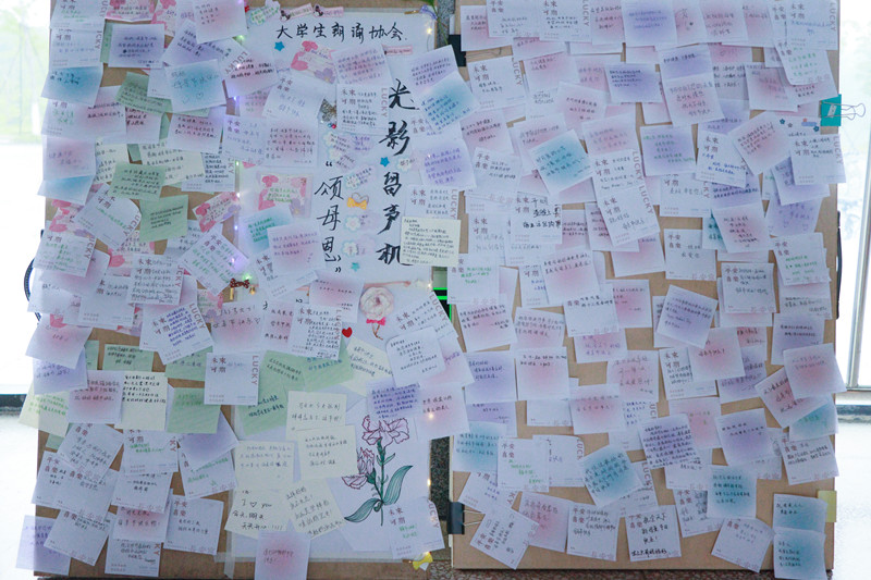 “听说神无处不在,所以就创造了妈妈!”“特殊的日子给妈妈特别的祝福!”“愿岁月对你温柔以待!”……一张张写满祝福的便利贴被贴在展板上,传达着学生们对母亲最真挚的谢意。5月8日,大学生朗诵协会举行一场光影留声机“颂母恩”的母亲节特别活动,近500名学生参与活动中向妈妈表达感谢。