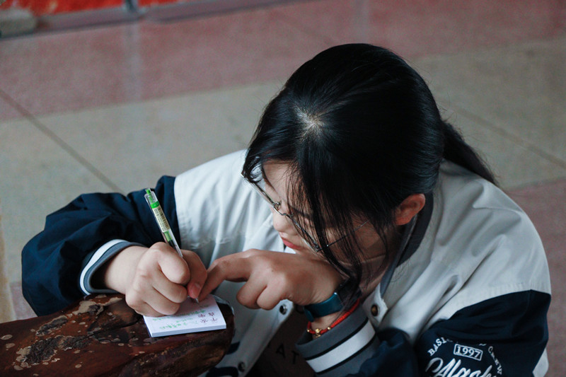 在外国语学院一楼,许多学生手拿着便利贴和笔准备写下对妈妈的祝福,他们有的蹲在地上写下祝福,有的以墙为板写下寄语,有的趴在板凳上写下感谢。
