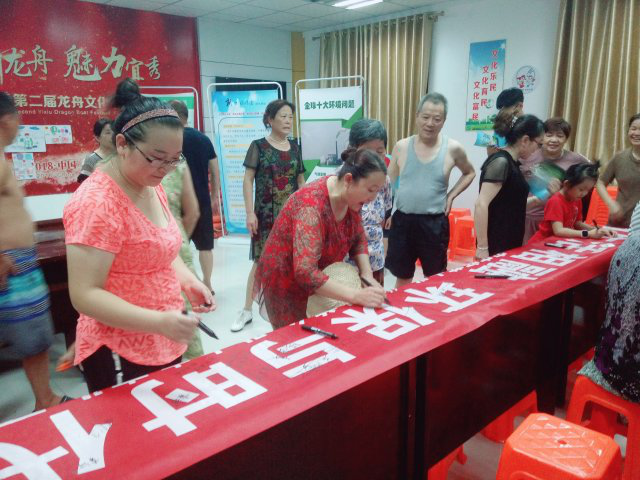 不一会儿,广场上的居民陆陆续续地来到举办环保宣讲的会议室。现场气氛十分热烈,服务团成员指引他们在横幅上进行签字仪式,以示环保之担当。