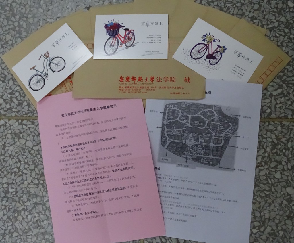 今年法学院迎来了190余名新生,每一位来到报到点的新生都会收到一个信封,信封里有明信片、针对大一学生的防骗防盗指南,银行、快递点、学院的地图等等。“信封里的明信片新生可以写下对自己未来四年学习生活的畅想,为新生提供一个与自己对话的平台,不忘记自己刚上大学时的初衷,坚守自己最初的梦想。希望借此机会让同学们不再迷茫、彷徨,明确方向,朝自己的梦想不断努力。”法学院学生会主席卢耀健介绍。