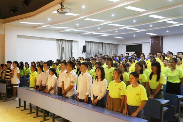 “我宣誓,作为未来的新闻工作者,我将忠于党的新闻事业,遵守党的新闻纪律,继承和发扬党的新闻工作的优良传统,坚持客观公正的职业理念,坚守社会责任,弘扬职业精神……”在王业明的带领下,2018级全体新生郑重地许下誓言。