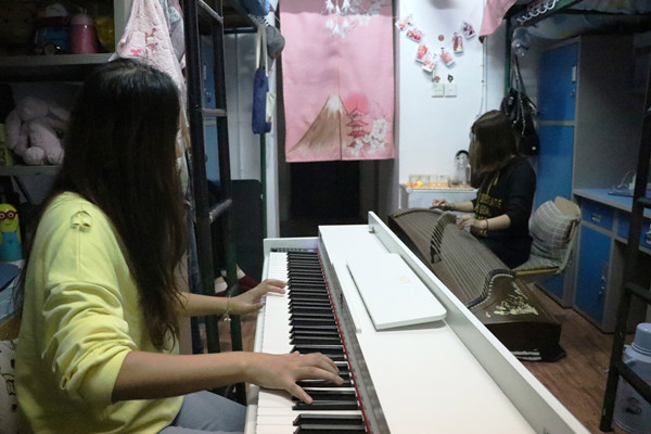 “就像古筝和钢琴一样,虽然演奏的风格不同,但也能相互配合演奏出和谐的曲调。我们寝室四个人来自不同的地方,性格也不尽相同,相处一年之后,我们的关系非常和睦,合作表演的歌曲是寝室的友谊与和谐的最好证明。” 汪珺文说。