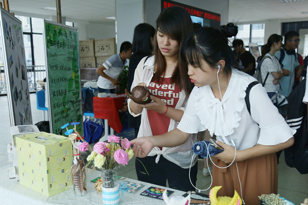 “我国的水存在的问题主要有两个……”解说员娓娓道来,向参观的行人详细介绍了我国的环境污染问题以及全球十大环境问题。一张张环保摄影作品,或是弥天雾霾,或是正在冒烟的烟囱,或是满池塘的垃圾……透过镜头,参观的人们更深刻地认识到环境污染带来的严重后果。来自传媒学院广播电视学专业2016(1)班的忝杭杭说:“以前对环境污染并没有什么直观的感受,但是今天通过这些照片真的深刻认识到了环境污染的严重性。”而现场资环学子们用快递盒子做出来的星星灯、用鸡蛋壳拼出来的孔雀、用便利贴折出来的小猫等精致而又富有创意的手工艺品更是引来了不少路人的围观。