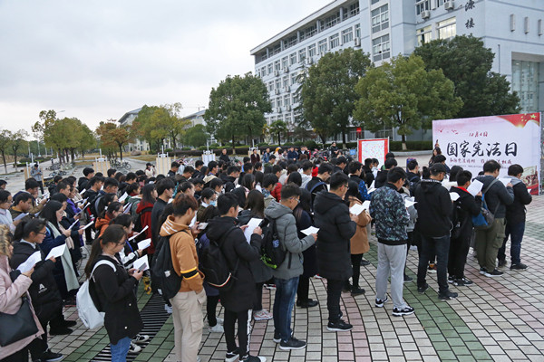 “宪法者,法上之法,根本之法,母法也……”12月4日清晨,beat365官网法学院的193名学生集聚在国旗下,朗读《宪法日诵读词》,并开展系列活动迎接以“尊崇宪法、学习宪法、遵守宪法、维护宪法、运用宪法”为主题的2018年。