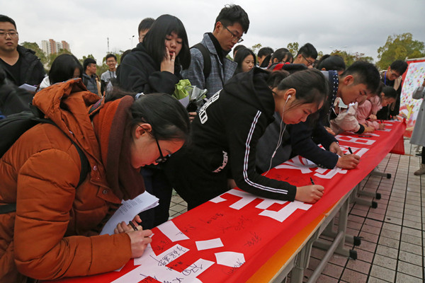 “法律是我们每个人都要遵守的底线”、“尊崇宪法,热爱宪法”、“做一个合法公民”……晨读结束后,学生们将一张张写有自己对法的理解、自身信念的便利贴贴在展板上、在宣传宪法的横幅上签字并对宪法进行宣誓。“在宣誓的时候感觉很庄严,很激动。”知识产权专业2018级的陈俊玲感慨地说,她觉得这样的活动办得很有意义,活动形式也可以再多一些,大学生需要这样的活动,可以带动大家学习法律知识。
