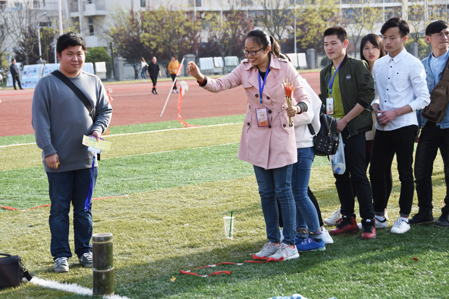 “李白的诗风是什么?”“李白诗风豪放!”这边社团负责人刚问完,就有同学迫不及待地回答,这是欢畅游园环节里“经典文学常识”的游戏现场。东门操场上随处可见这样的趣味小游戏,这里知识问答忙得不亦乐乎,那边“手指游戏”、“桌游”、“投壶”也吸引不少同学参与。