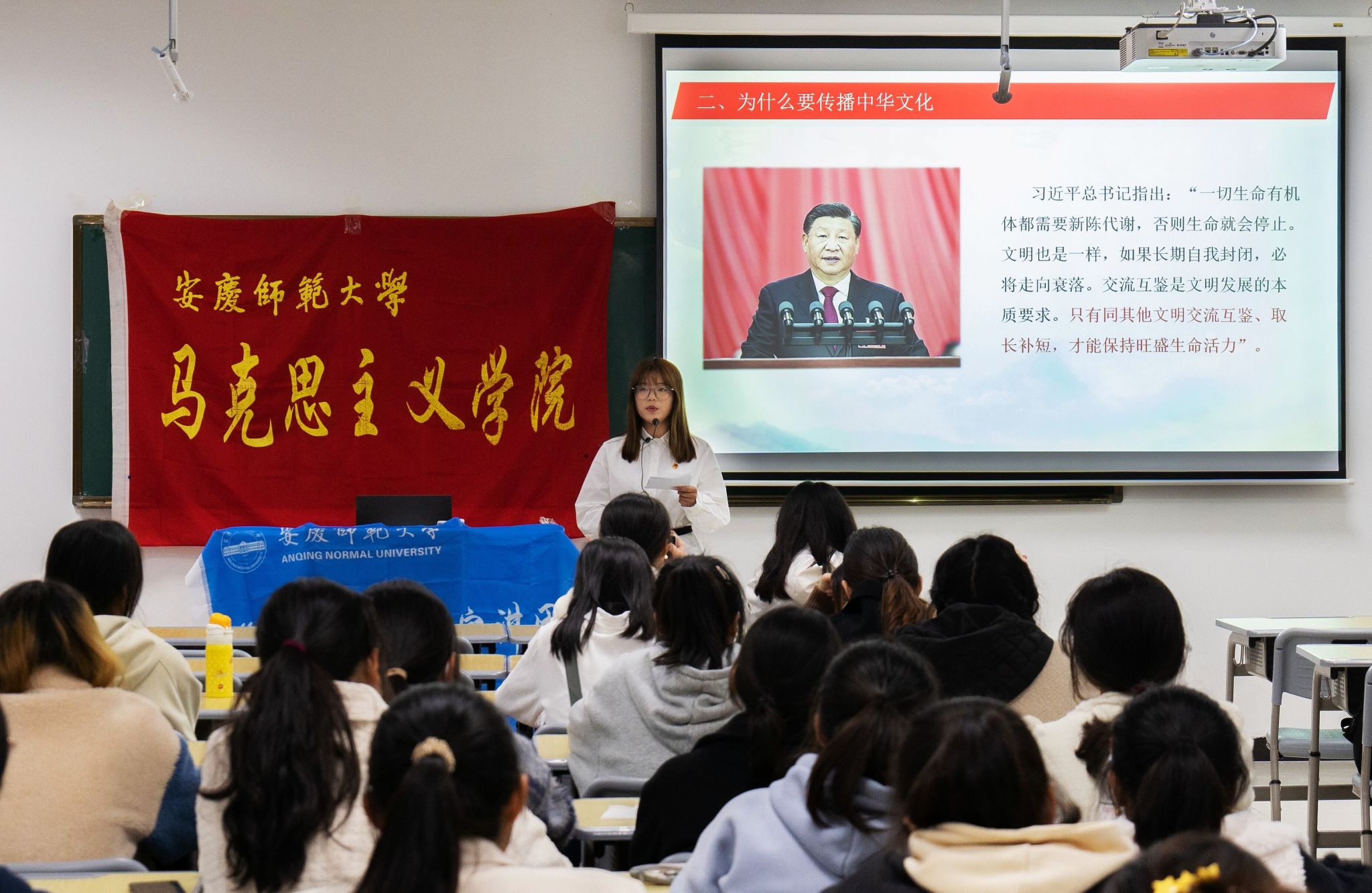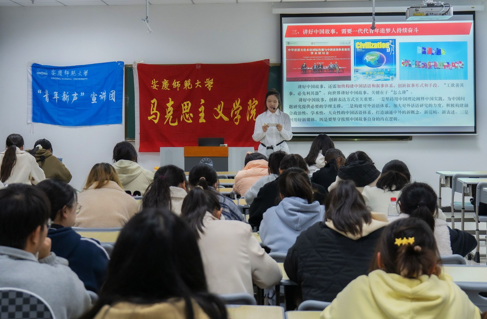3月23日,马克思主义学院在Q212开展以“增强中华文明传播力影响力,讲好中国故事”为主题的宣讲活动,本次宣讲由“青年新声”宣讲团主讲,学院第三期青马班和第二期团校培训班全体学员参加。
