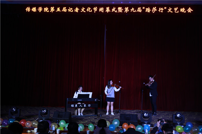 晚会中,乐器合奏节目《不染》选自今年热门电视剧中的配乐,深受学生欢迎。当钢琴和小提琴声音相继响起,曲折婉转的声音在报告厅内环绕,现场观众沉醉其中。广播电视学专业2018(2)班的李玉衡是小提琴演奏者,他说:“我们对表演曲目问题考虑了很久,最后决定表演《不染》,因为这首曲子比较受大众喜爱,我们希望能通过这个节目展示自己,也能让同学有更好的听觉感受。”