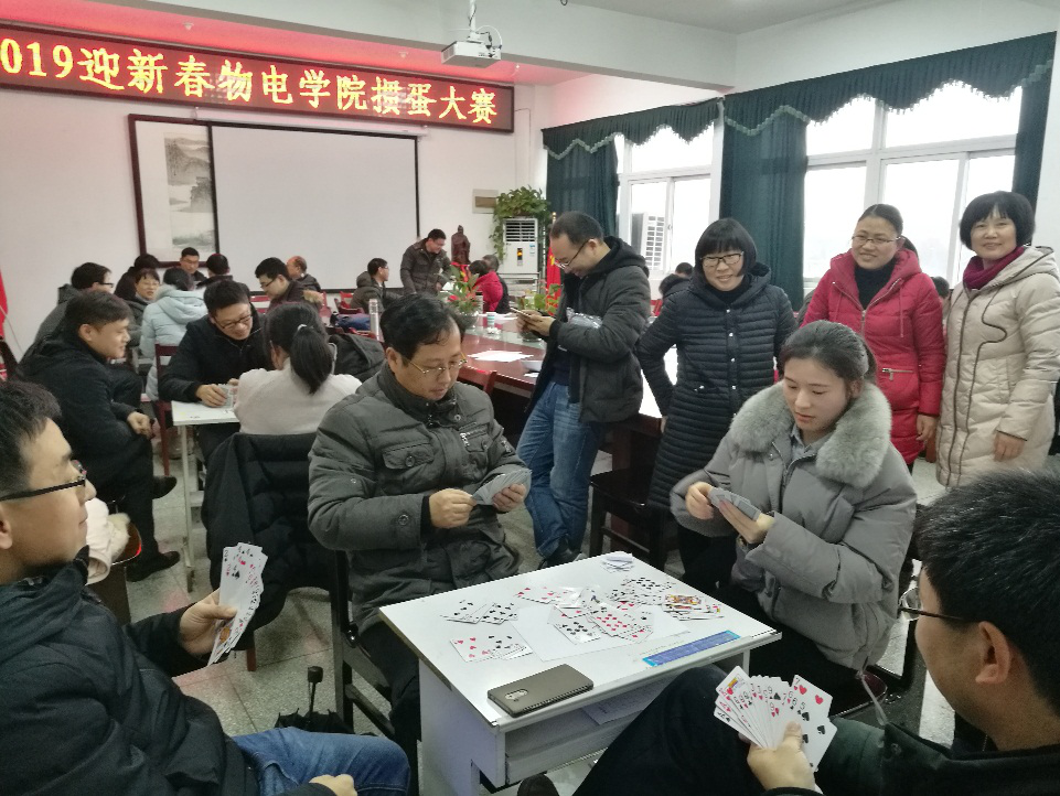 为进一步丰富学院教职工的业余文化生活,促进交流,愉悦身心,营造欢乐、祥和的迎新氛围,12月26日下午,物理与电气工程学院在学院会议室举办了教职工掼蛋比赛。