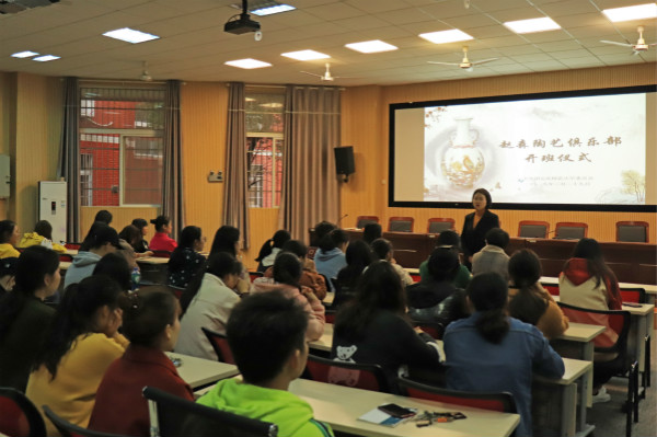3月29日晚,赵森陶艺俱乐部开班仪式于美术学院报告厅举行。校团委副书记赵丽丽、校团委副书记方蓬、美术学院相关老师及50名新学员参加此次开班仪式。