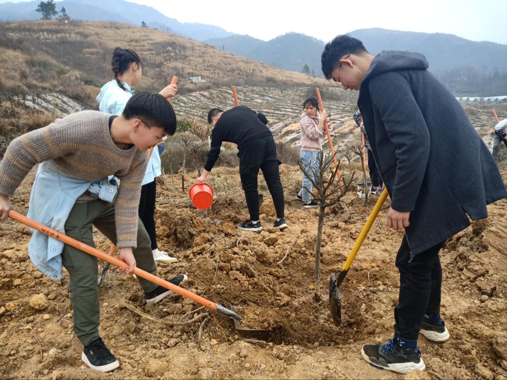 抵达目的地后,该景区专业人士向志愿者们介绍了树的品种并对植树操作进行了演示。“你们种的这个树叫梅树,它拥有顽强的生命力,无论经历多少次砍伐,都会不断地钻出嫩芽、抽出枝条,希望你们能够学习到梅树这样坚毅的精神,去解决生活中的种种困难。”大家学会植树要领后,纷纷摩拳擦掌、跃跃欲试。只见志愿者们配合默契,操作娴熟,很快的投入到植树活动,一些男生前往池塘搬运水资源,其余同学挥锹铲土、扶树浇水,每个人都忙得不亦乐乎。在大家的共同努力,小树苗们直挺地站在了大龙山脚下的土地上,为周围的环境添加了一丝生机,志愿者们纷纷露出了欣慰的笑容。