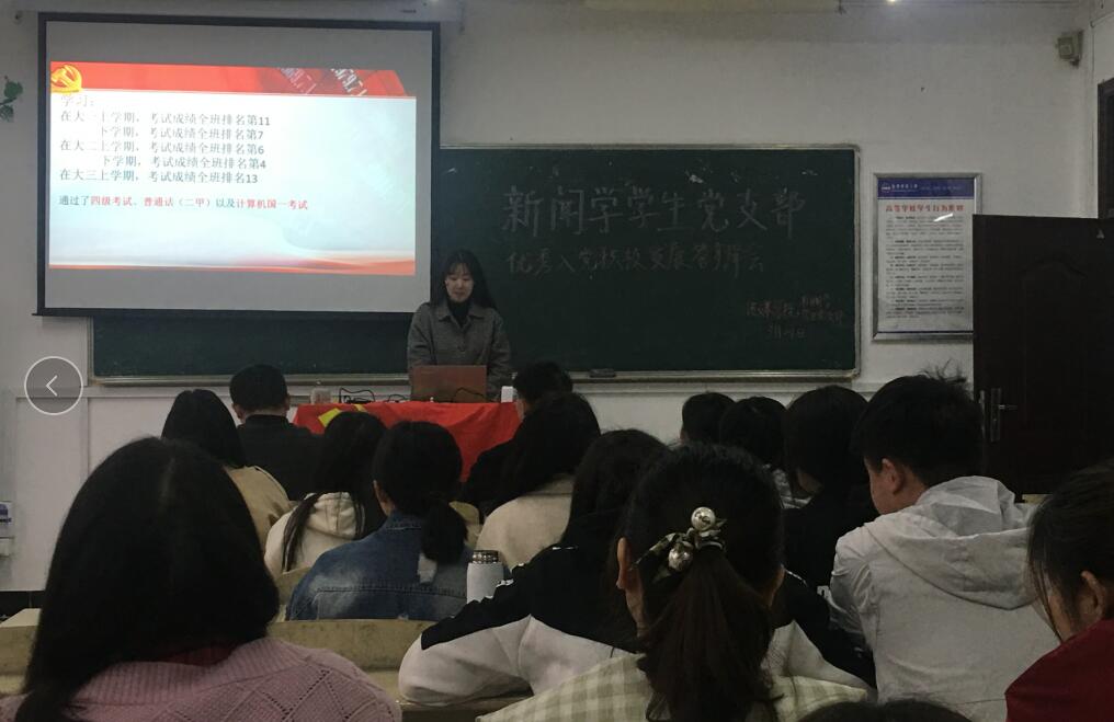 3月22日和24日,传媒学院新闻学学生党支部和广播电视学学生党支部分别举行优秀入党积极分子发展答辩会。答辩会由各学生党支部负责老师主持。各党支部成员及学生代表担任此次答辩会评委。