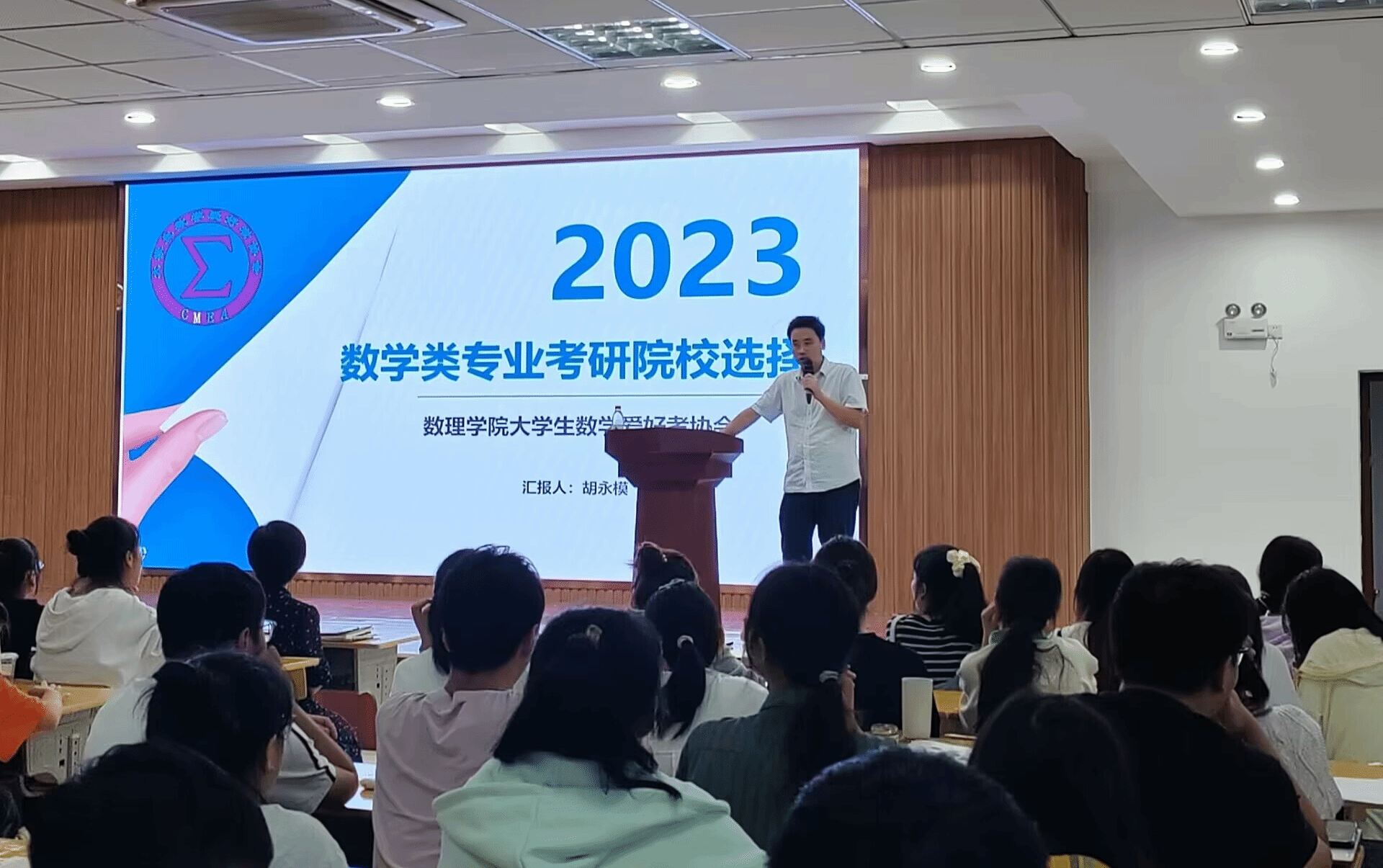 近日,数理学院大学生数学爱好者协会在401报告厅举办数学类专业考研院校选择专题报告,协会指导教师胡永模为全体考研学子开展了一场全面、精准、细致和科学的院校选择指导。学院党委副书记彭芳珍主持会议,数学与应用数学专业近200名学生参会。