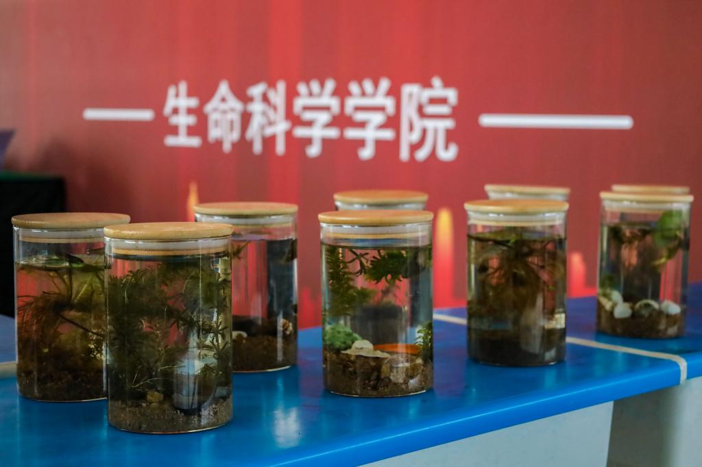 今年新增设的生态瓶展览也成为“热门项目”。学生们围在各式生态瓶旁,积极地探讨着生态瓶运转机制、制作生态瓶流程等问题。