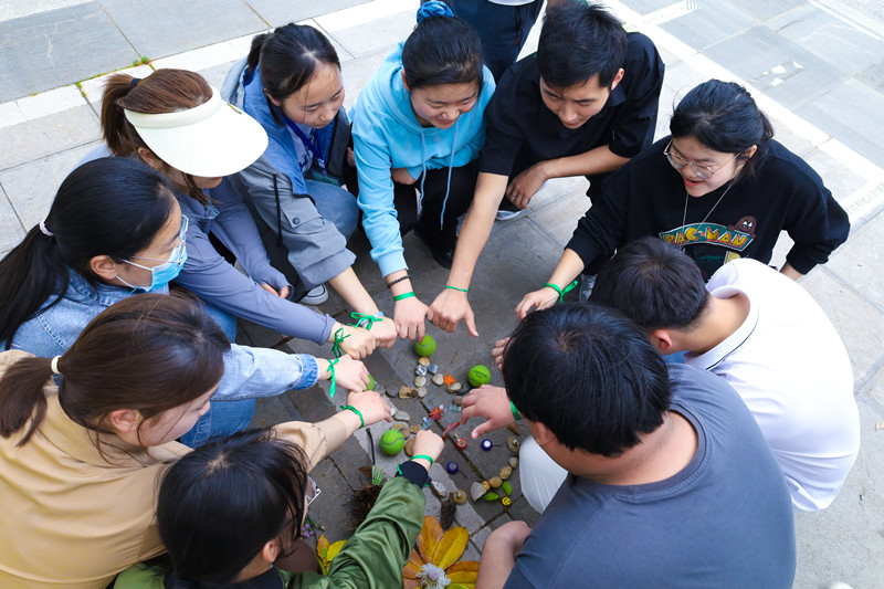 石头排列成庭院的围栏,瓶盖做成院子里的桌凳,树枝、石头、树叶等搭成各个字母,代表家庭中的成员。“这个作品的创作灵感来源于央视在2012年推出的一个公益广告《FAMILY》。”据外国语言文学类专业2021级(12)班的学生张天宇介绍,他们借这个广告的寓意表达了绿源的成员们就像一家人,相亲相爱。除此以外,学生们还创作了绿源协会的会徽、动画片角色喜羊羊等。会员们在团建游戏中结束了今日的活动,并带着绿源协会会旗、团旗进行合影留念。