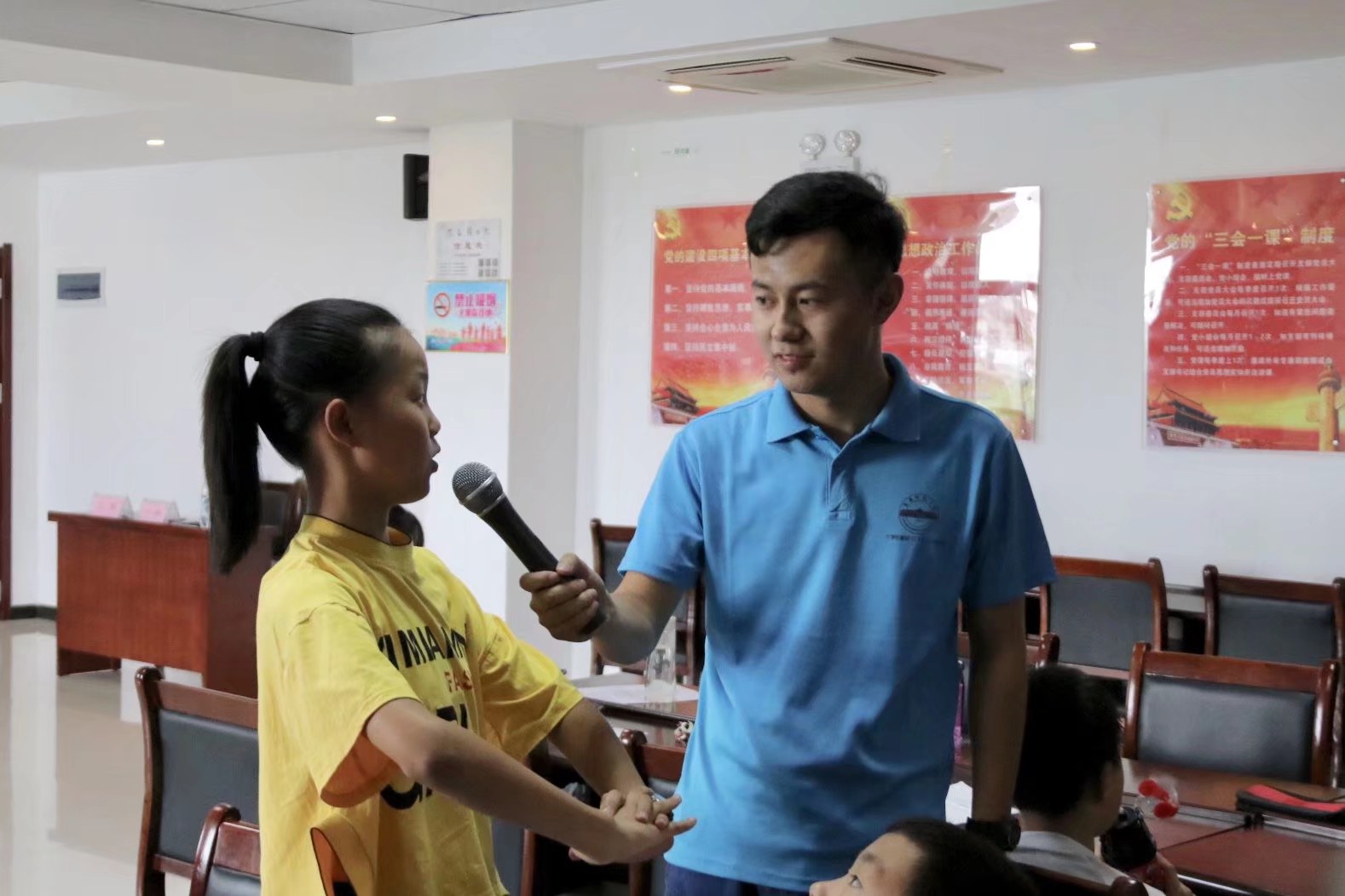 “双手交叉,按住胸口,保持手臂与胸口垂直,反复按压……”特殊教育2017级潘润飞作为安全教育老师,正在向小朋友们演示“胸部按压法”的正确操作。小朋友们围坐在老师身边,认真地看着,一边询问一边跟着老师演示。“我能深刻地感受到老师按压时的力量,所以对老师讲的内容记忆很深刻,我认为我以后可以很好地运用。”作为示范对象,五年级的杨诚然在结束后坚定地说。