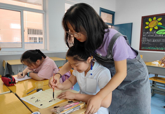 图为志愿者教小朋友练习书法 摄/吴彤彤